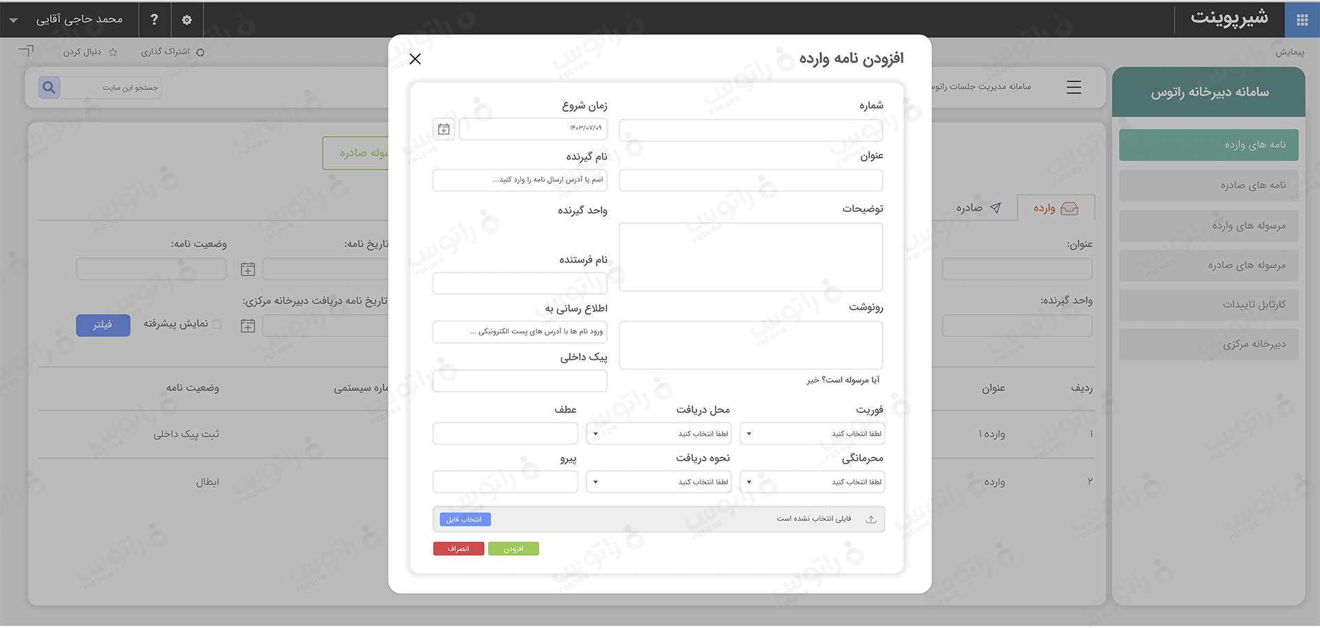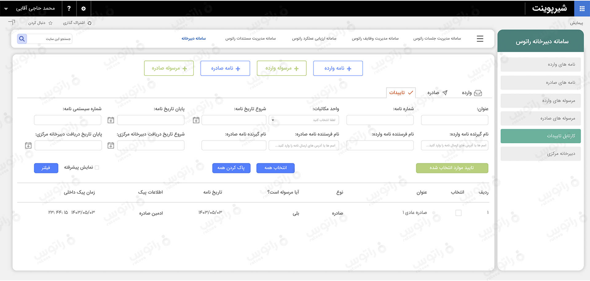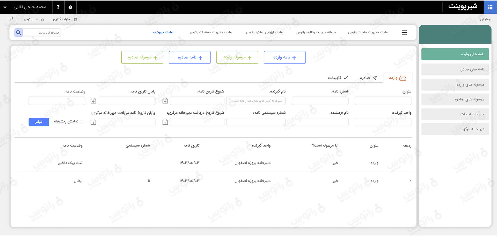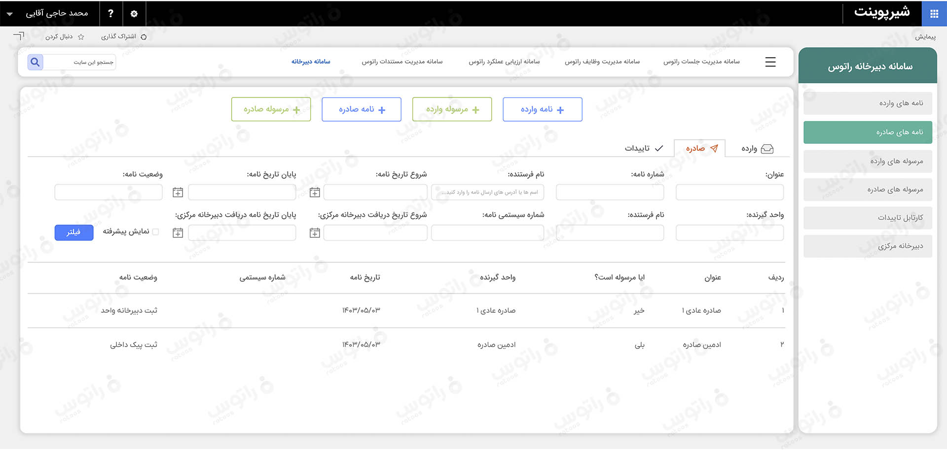 راتوس با ارائه نرمافزار نامههای وارده و صادره مبتنی بر شیرپوینت، راهحلی جامع برای رفع نیازهای شما ارائه میدهد. این سامانه با رابط کاربری آسان، کاملاً تحت وب و با پشتیبانی از تعداد نامحدود کاربر طراحی شده است.